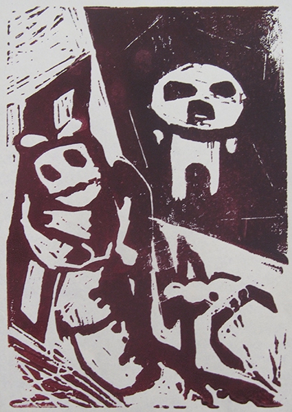 Im Profilkurs Kunst wurden verschiedene Drucktechniken erarbeitet und besprochen. Die Beispiele zeigen Hochdrucke (Linolschnitt).