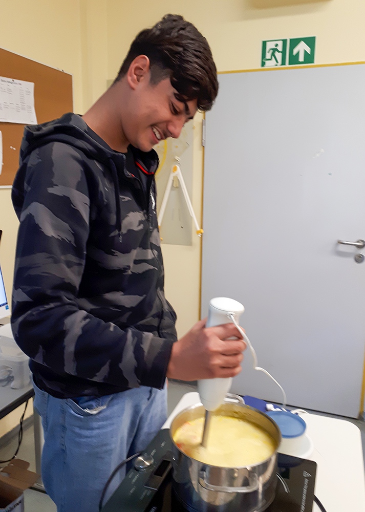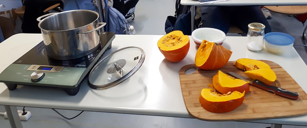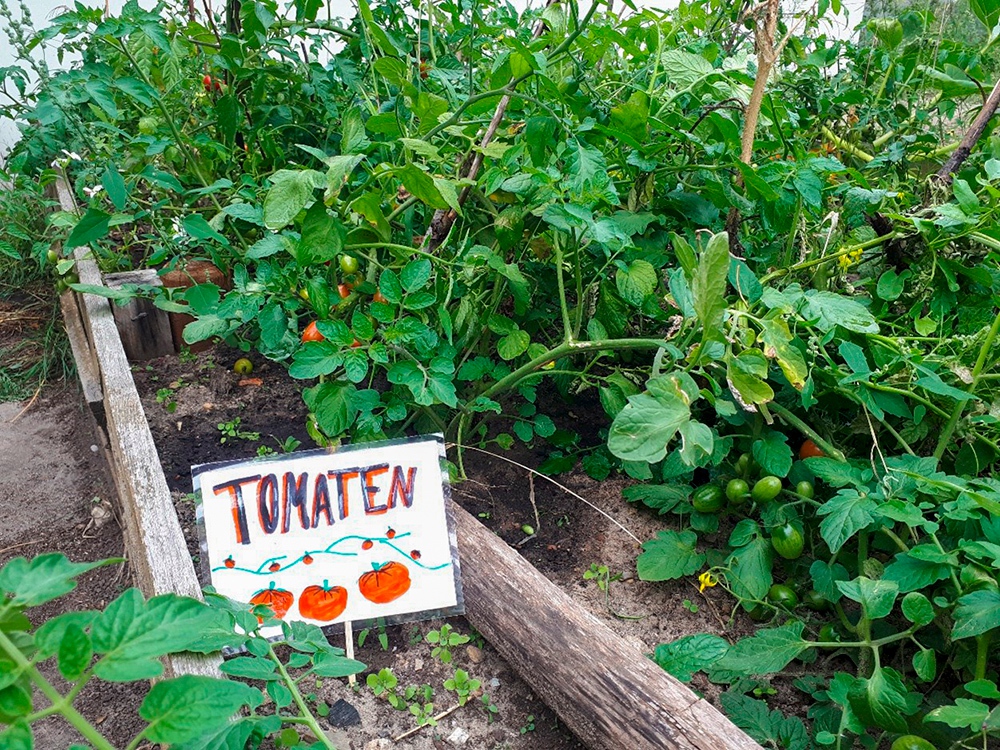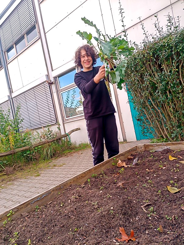 Herr Wolfgang Dithmer half tatkräftig, sodass im Herbst Kürbis, Tomaten, Kohlrabi und Co geerntet werden konnten. Alles wurde dann lecker zubereitet und am Ende eines langen Unterrichtstages zusammen verspeist.